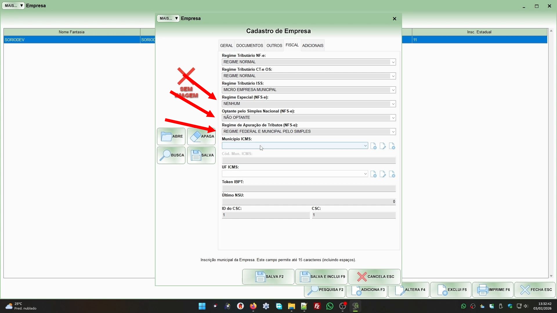 Dentro do cadastro da empresa, informe o nome dela, o e-mail, o endereço e o telefone na aba GERAL. Já na aba FISCAL existem 3 novos campos que também precisa preencher de acordo com a sua situação, todos indica dos com o parêntese "(NFS-e)":
