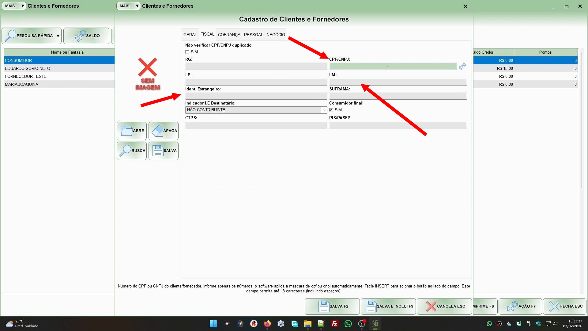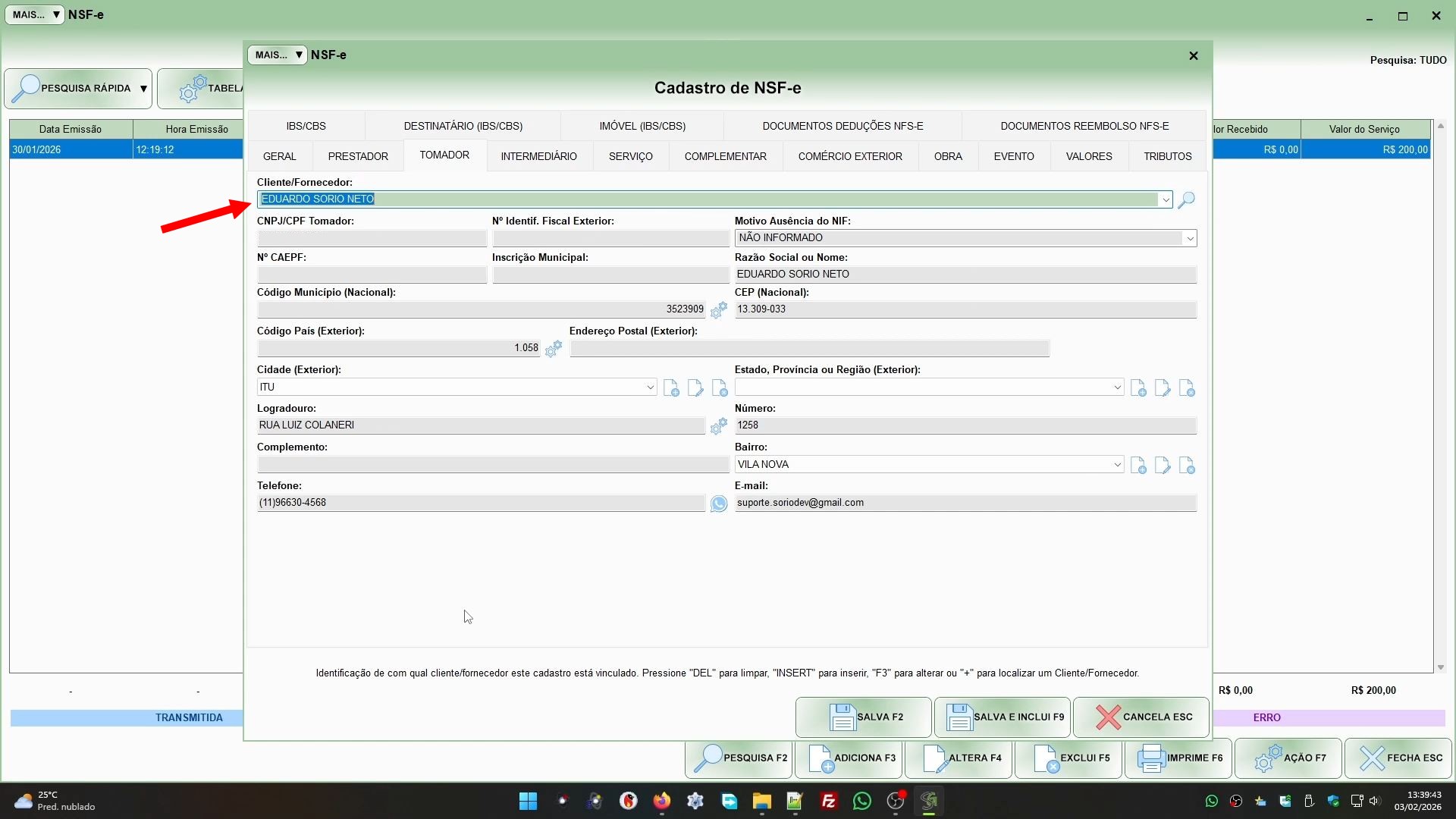 Na aba TOMADOR, selecionando o cliente o sistema captura os dados dele.