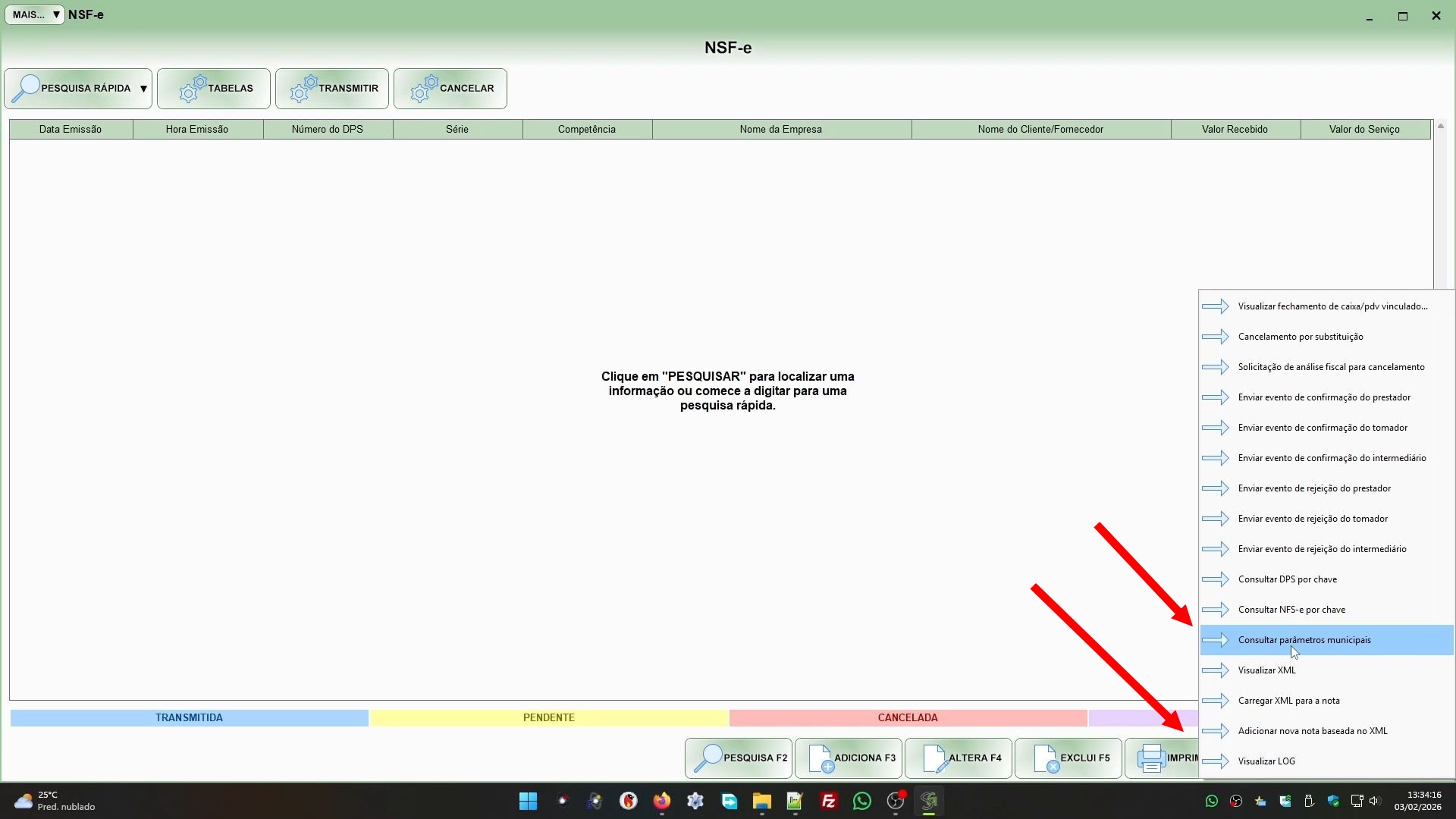 Lembra do que falamos lá no início? Sua cidade precisa ter aderido ao emissor. Para saber disso, existem duas formas. A primeira é dentro do sistema mesmo. Clique em AÇÃO, e em CONSULTAR PARÂMETROS MUNICIPAIS: