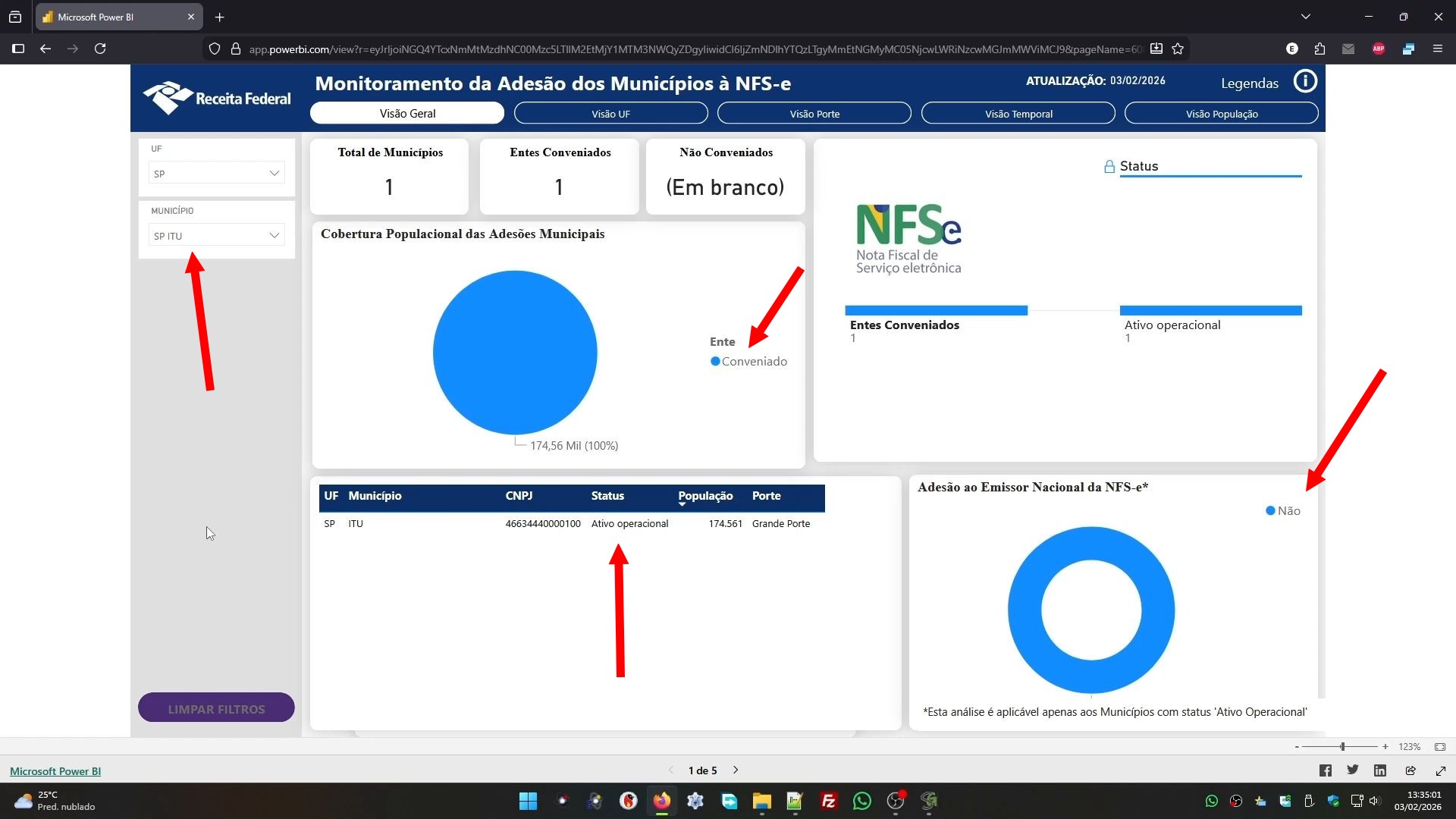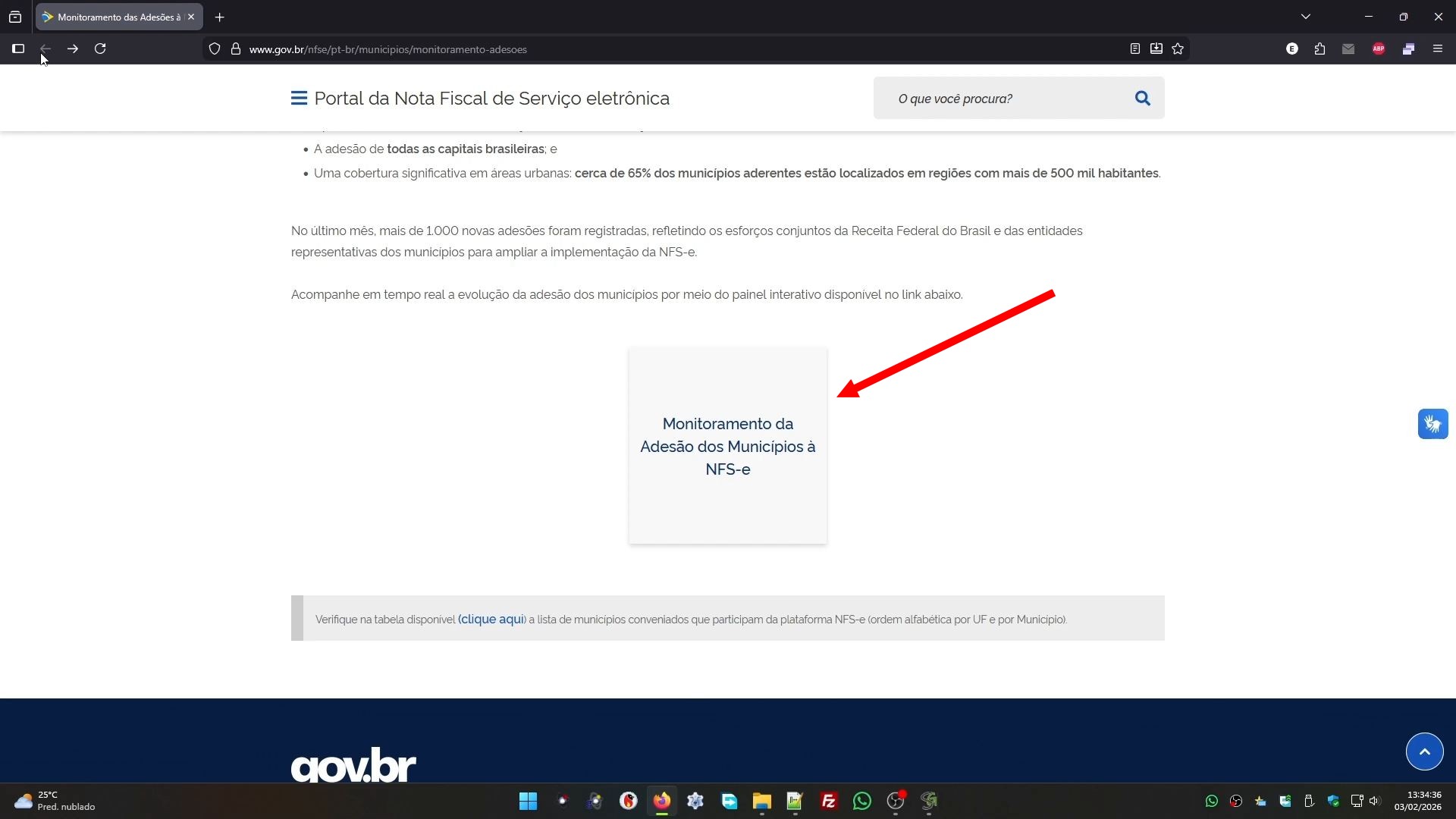 No centro da tela terá uma seção COBERTURA POPULACIONAL DAS ADESÕES MUNICIPAIS, que mostra se a cidade é conveniada, e mais abaixo uma lista indicando se está "ativo operacional". Já a esquerda tem a seção ADESÃO AO EMISSOR NACIONAL DA NFS-e, é necessário que apareção SIM aí. Se estiver não, como na imagem, não conseguirá emitir a nota.