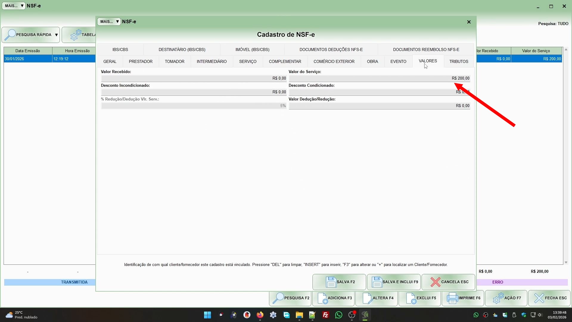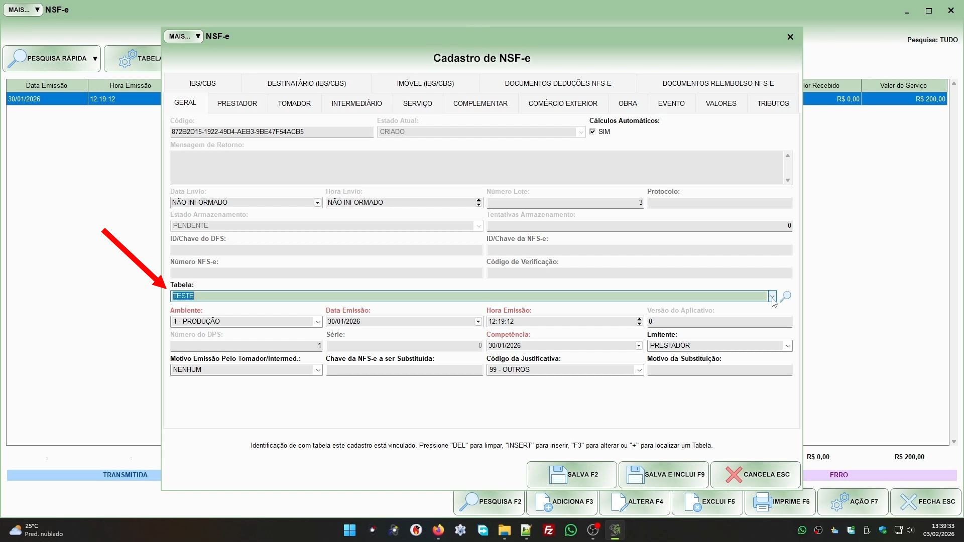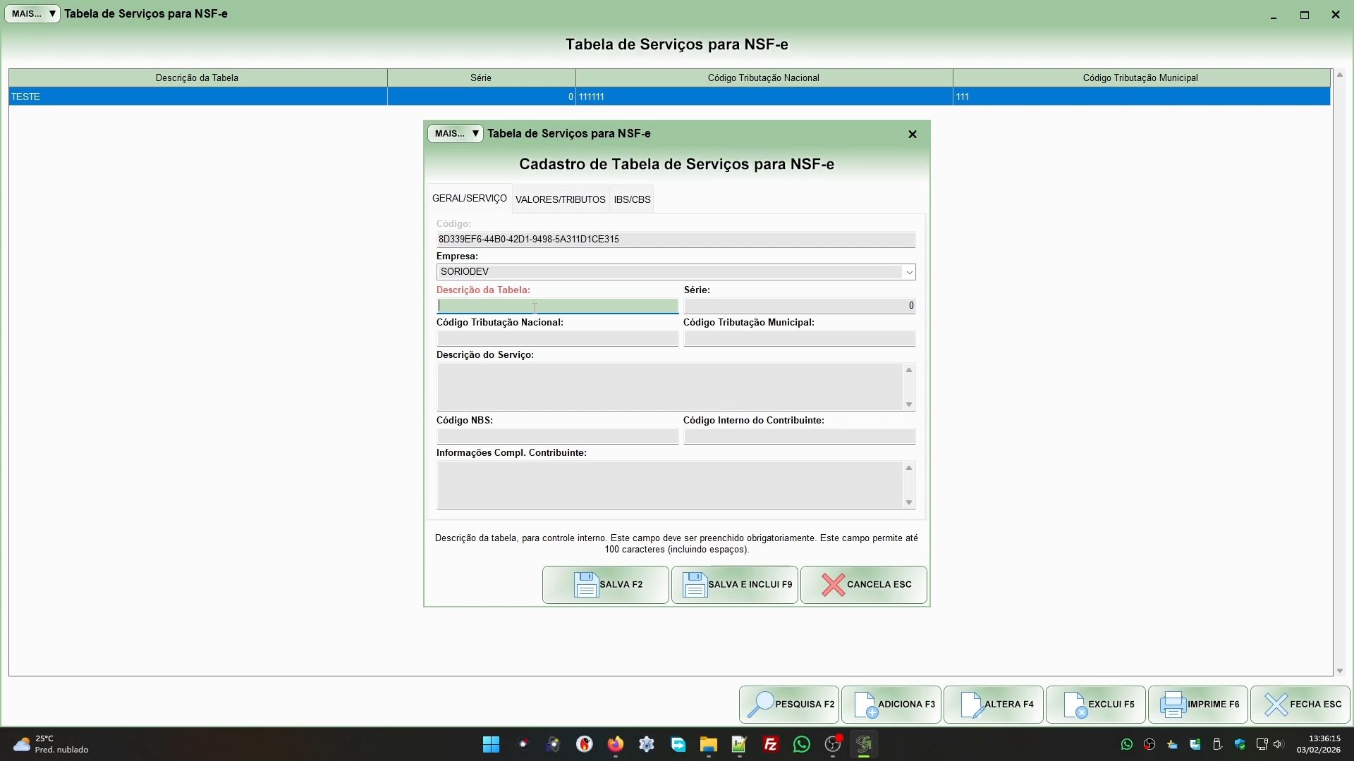 Não foi incluído nesse módulo nenhum tipo de pré-validação de campos obrigatórios, como existe nos demais documentos fiscais eletrônicos do sistema, então você deve preencher de acordo com as instruções do seu contador. Preencha o código de tributação nacional e municipal, a descrição do serviço, e caso precise as demais informações. Perceba que existem abas para valores, tributos, e para o IBS/CBS, referente a reforma tributária.