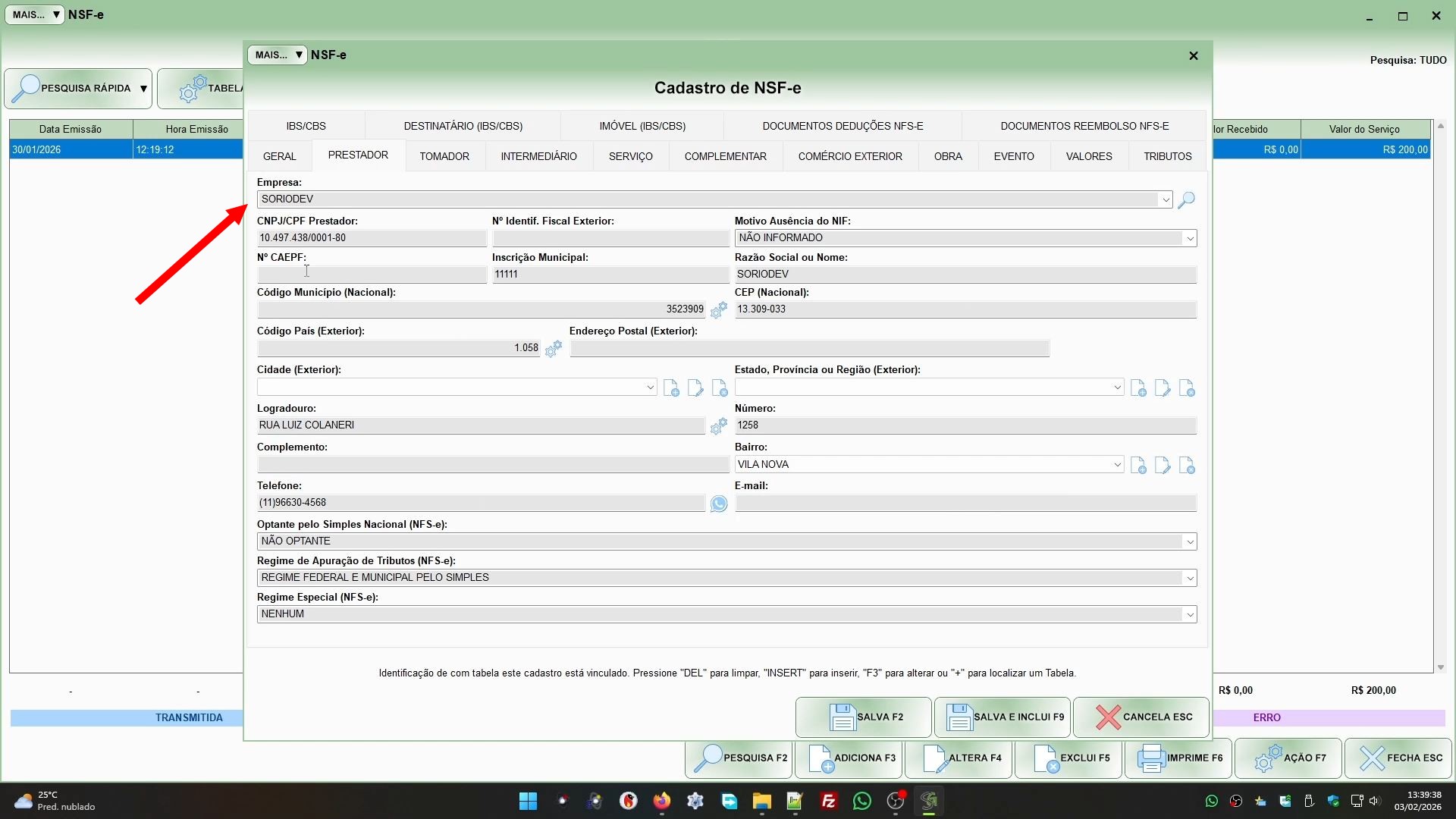Na aba PRESTADOR, selecionando a empresa o sistema captura os dados dela, ele também já faz isso sozinho.