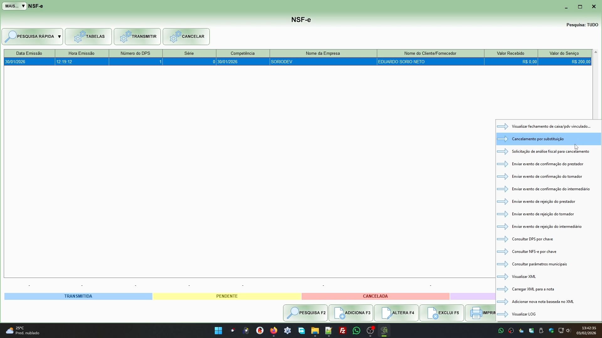 Diferente de outros módulos fiscais, o de NFS-e não tem as etapas de gerar xml e transmitir em separado. Isso acontece porque o sistema o xml de o documento chamado DPS - Declaração de Prestação de Serviços. Ao transmitir ele, a sefaz recebe e gera o xml da NFS-e. Aí o sistema faz uma consulta ao DPS para obter a chave da NFS-e, e depois faz uma nova consulta usando essa chave para obter o xml. Tudo isso é automático, mas caso algum procedimento falhe, e o sistema não consiga obter os dados, você pode acionar manualmente as consultas de DPS por chave e NFS-e por chave do botão AÇÃO, onde aliás você tem disponíveis vários outros eventos da nota: