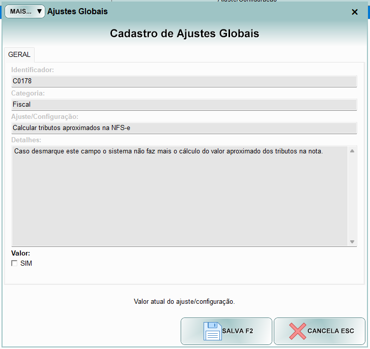 Se for o valor aproximado dos tributos (grupo totalTrib.vTotTrib), primeiro vá na tela inicial do sistema, entre em AJUSTES GLOBAIS, e localize o ajuste com identificador C0178: