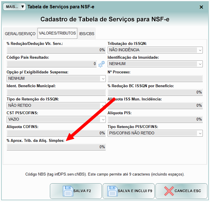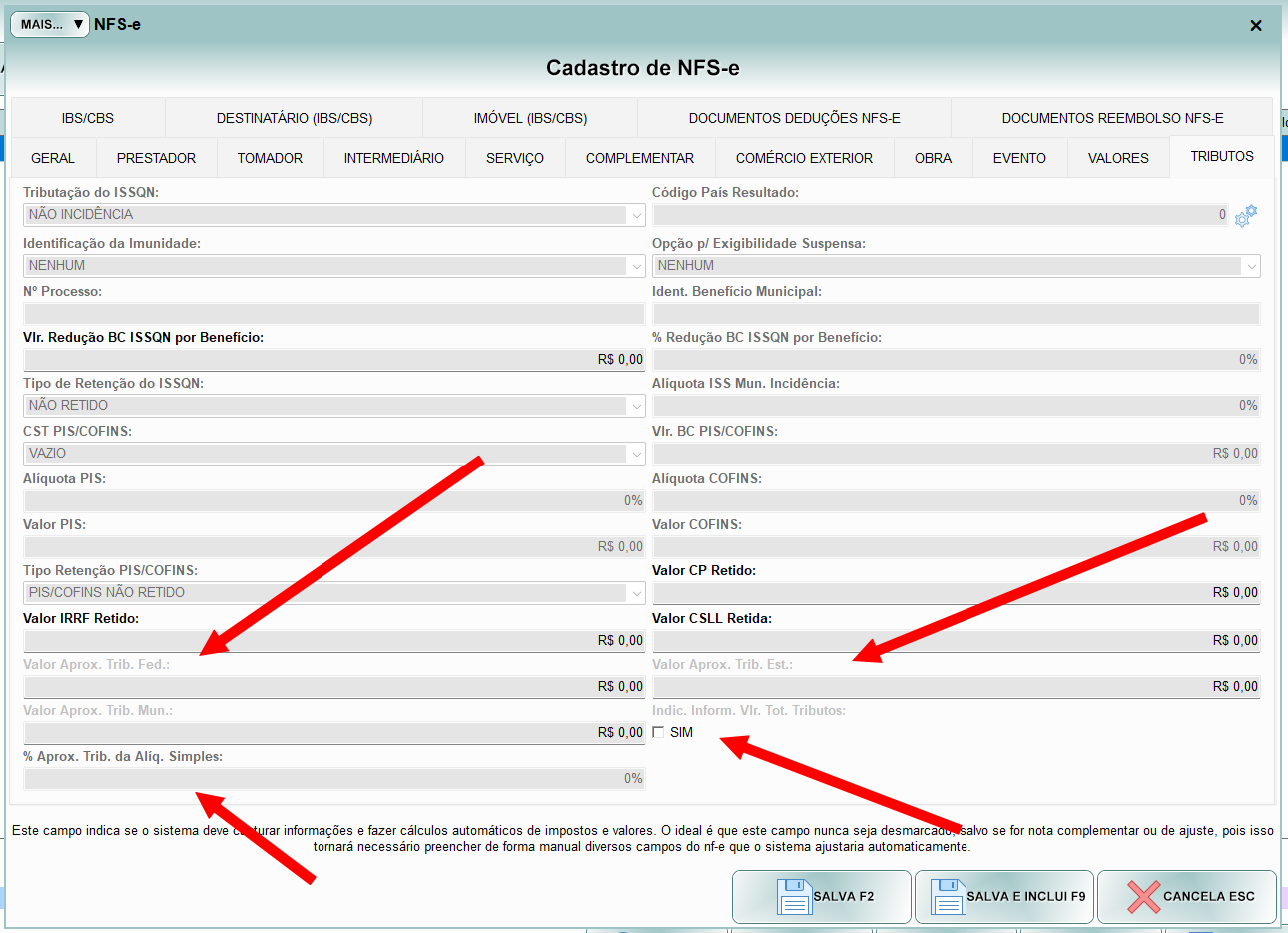 E vai preencher o % APROX. TRIB. DA ALÍQ. SIMPLES na aba VALORES/TRIBUTOS. Após fazer as correções necessárias, altere a nota e mude algo nela para salvar e forçar o sistema a recalcular os valores: