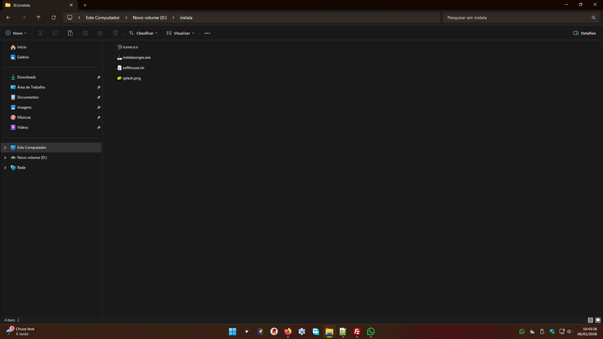 Você colocará tudo numa mesma pasta, o instalador do SORGES (instalasorges.exe), o arquivo de configuração (softhouse.ini), a imagem da abertura do programa (splash.jpg ou gif ou png), e o ícone (icone.ico), como aparece na tela acima.