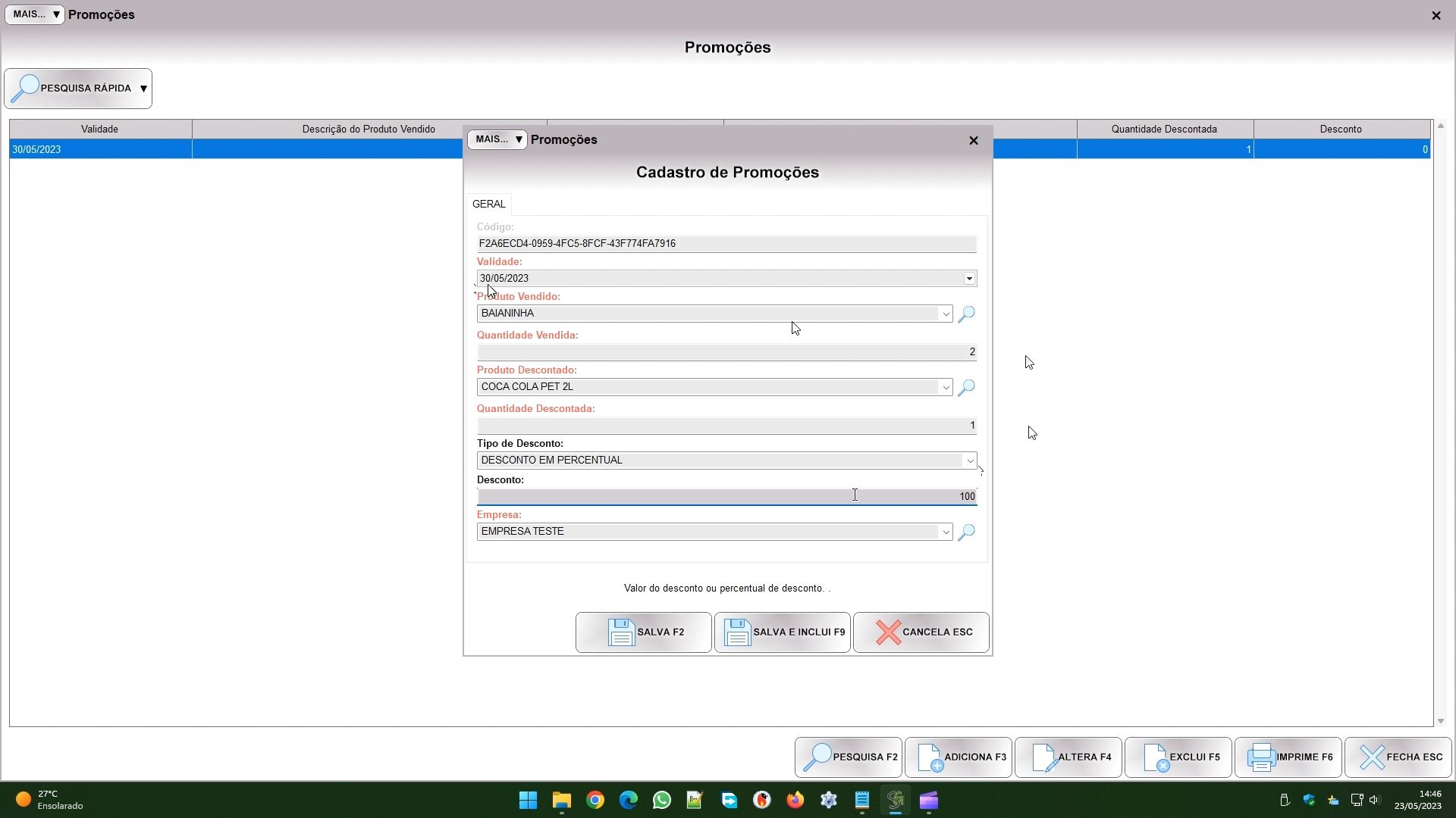 - PRODUTO DESCONTADO e QUANTIDADE DESCONTADA: referem-se ao produto que receberá o desconto, e a quantidade que receberá desconto;
