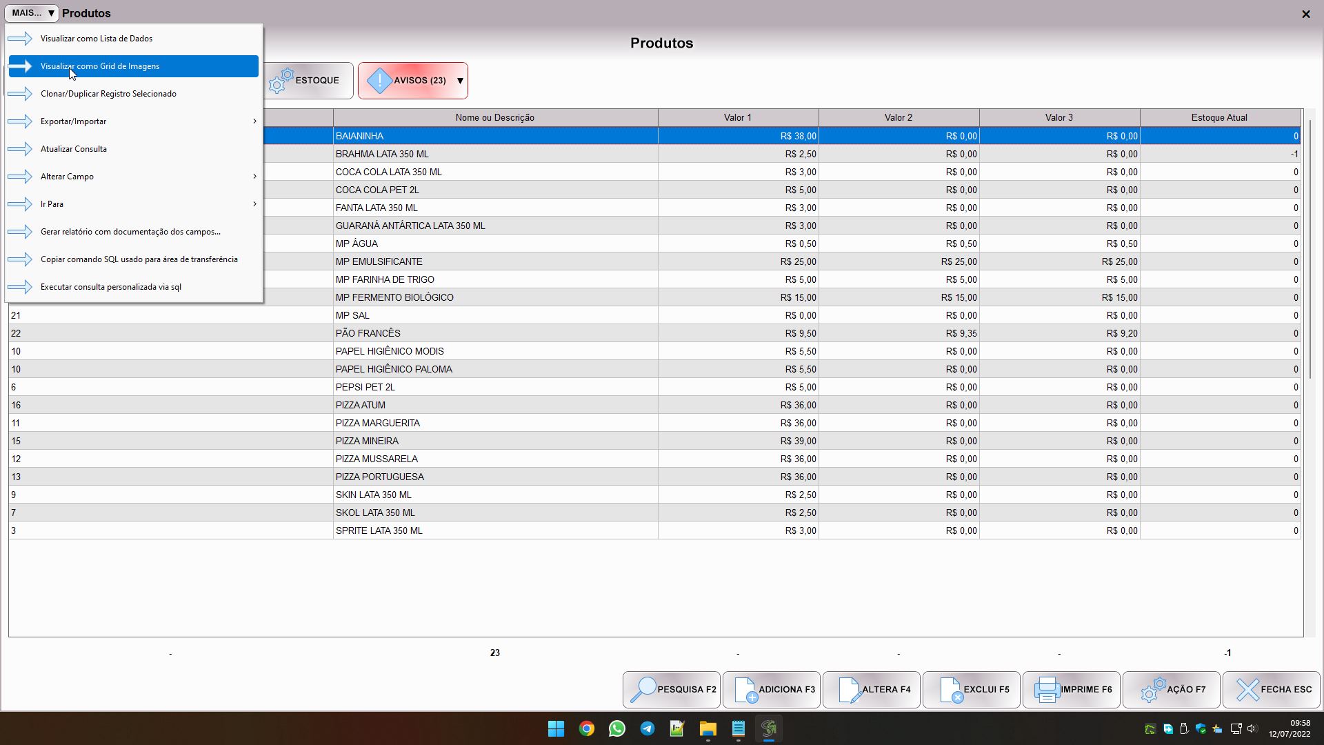 Nos módulos que possuem imagem, você pode clicar no botão MAIS, no canto superior esquerdo da tela, e verá duas opções no início do menu: VISUALIZAR COMO LISTA DE DADOS e VISUALIZAR COMO GRID DE IMAGENS. A primeira opção (lista de dados) é exatamente o formato que você vê nas imagens acima e abaixo.