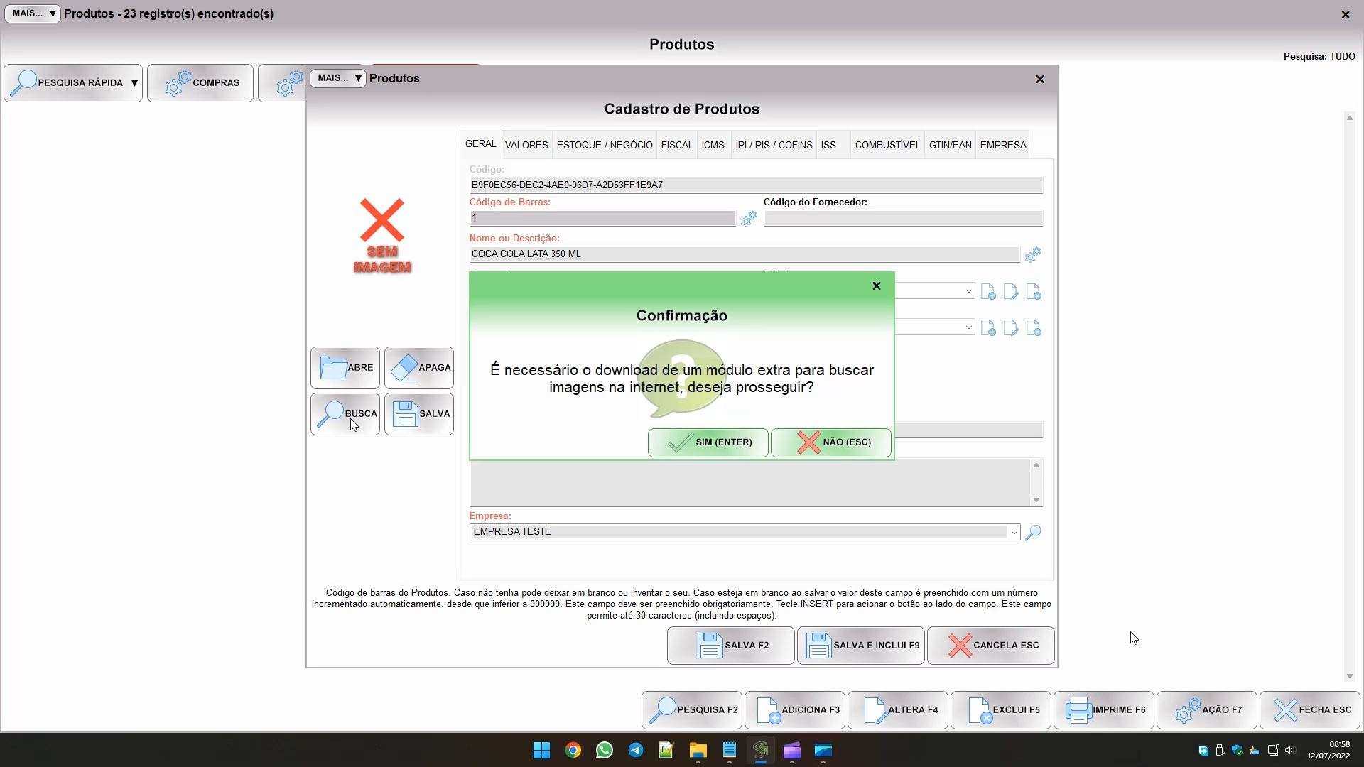 Para abrir a imagem você pode usar os botões ABRE ou BUSCA. Se for um cadastro de cliente, você provavelmente precisará de uma webcam, e capturar e salvar a imagem dele em arquivo no computador. Este recurso nosso sistema não possui. Já para um produto, por exemplo, é interessante buscar a imagem na internet, que com certeza terá um farto repositório de fotos do produto para você usar. Ao tentar buscar na internet pela primeira vez você verá esta mensagem: